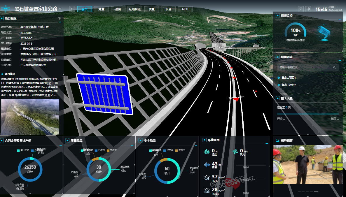 為強化風險管控,黑曾路項目部引入智慧信息化可視管理平臺,綜合運用BIM、GIS、物聯(lián)網(wǎng)、大數(shù)據(jù)、人工智能、無人機等先進技術(shù),構(gòu)建基于BIM+GIS+IOT+AI+PM的智慧工地平臺,實現(xiàn)進度、質(zhì)量、安全等全方位智能化管控。